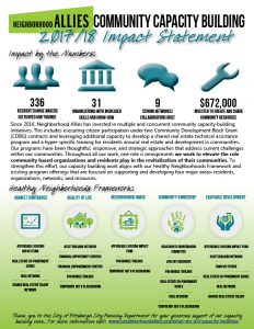 Neighborhood Allies has spent that last few years building out and deepening our communications, storytelling and design talent. This includes everything from rebranding our organization, to establishing a web presence/building our social networks, to undertaking strategic storytelling around the quantitative and qualitative impact of our work and investments using data and design.