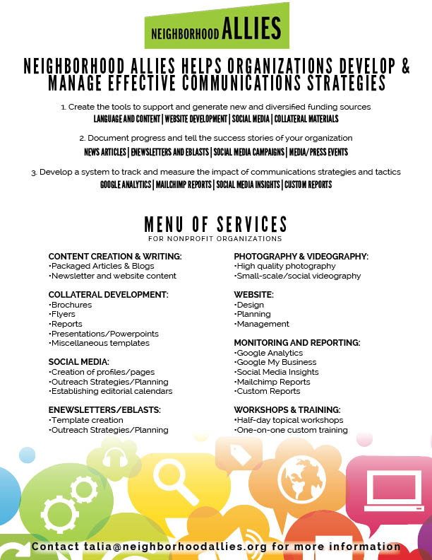 If your organization is interested in partnering with us on shared communications, or is in need of a specific service, contact talia@neighborhoodallies.org for more information and to discuss custom costs for your organization!