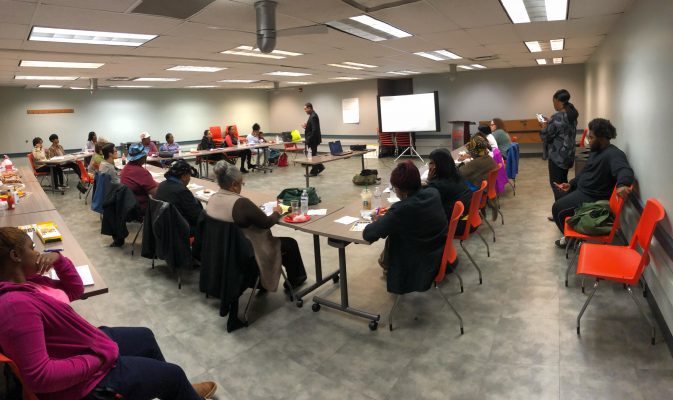 Residents listening to speaker Paul Abernathy of FOCUS Pittsburgh and discussing how lack of afforable housing, displacement, cost burdens, and inadequate housing lead to systemic trauma.
